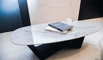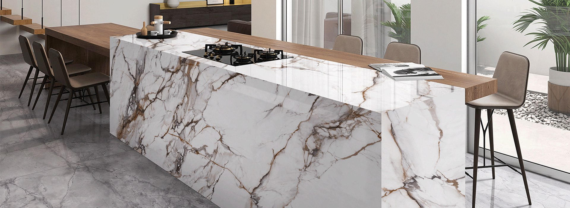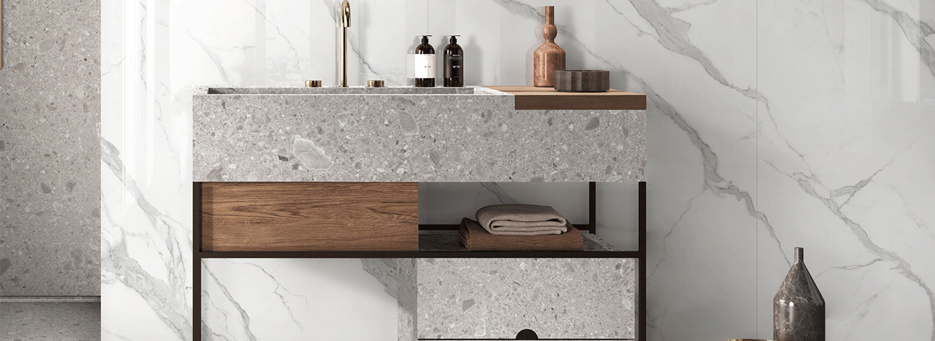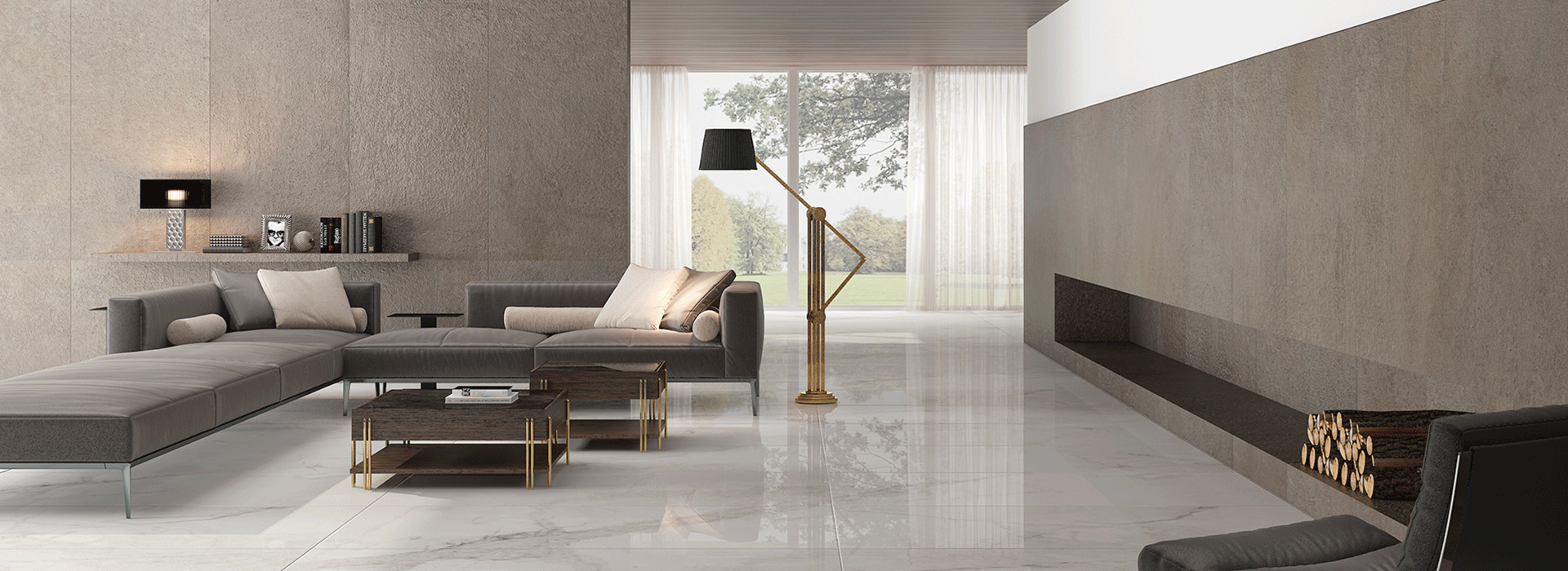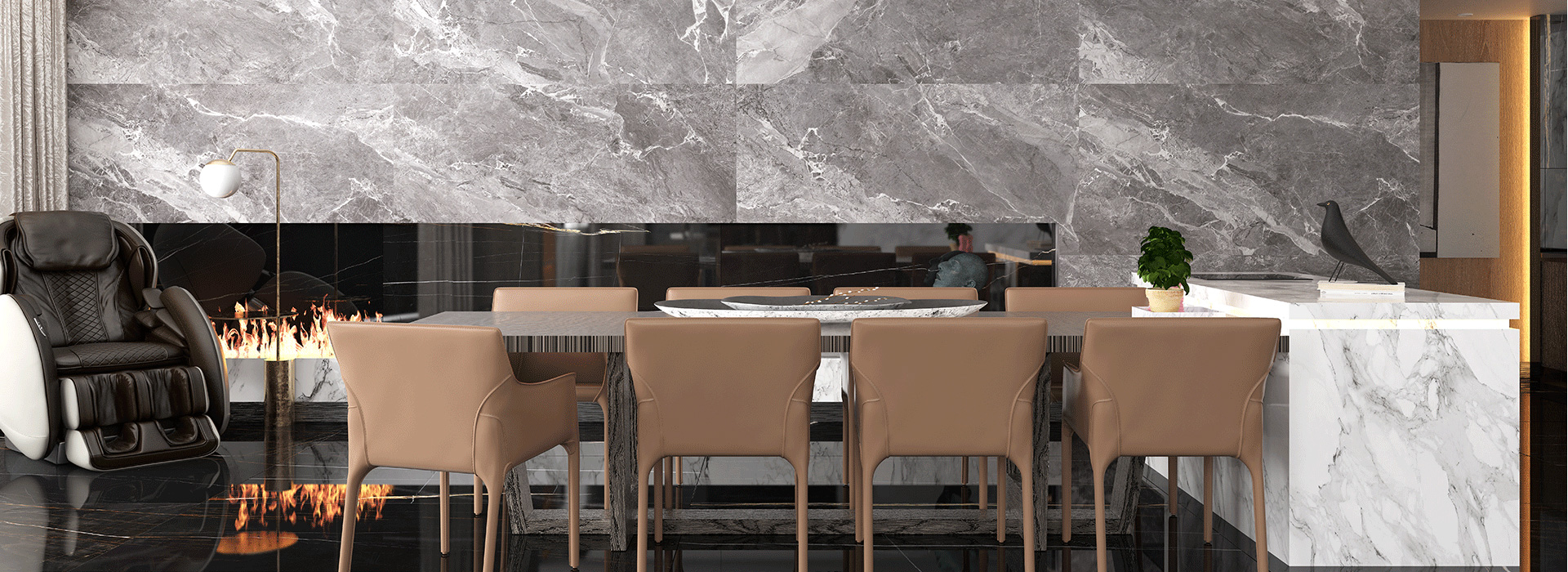 以流行的白、灰为主色调,纹理由仿材质肌理类和大理石石纹类组成,使用高科技喷墨技术呈现,打造冷暖色系。